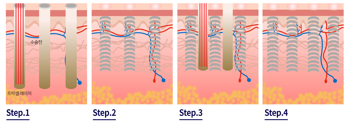 프락셀은 콜라겐과 탄력섬유의 생성을 촉진시켜 피부재생을 도모합니다.